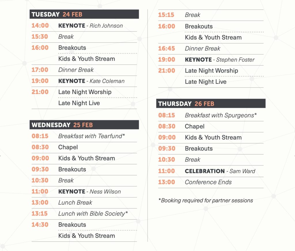 Our media team will be capturing photo and video content at these events for use on our social media and websites. If you would prefer not to be captured, please collect a yellow ‘No Media’ lanyard from the New Wine Info point in the foyer.